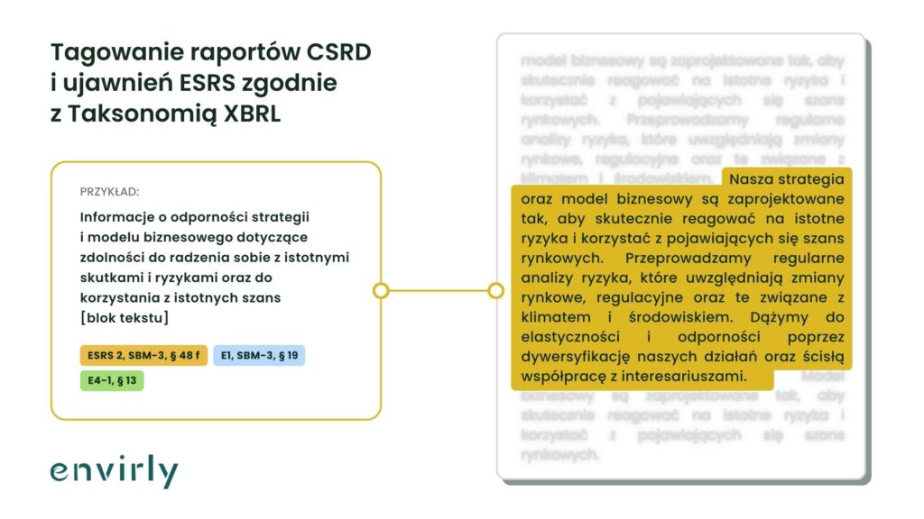Technologia XBRL pozwala na oznaczanie wszystkich istotnych elementów raportu – zarówno tekstu, jak i danych tabelarycznych – w oparciu o hierarchiczną strukturę taksonomii. Każdy element raportu zostaje powiązany z odpowiednimi przepisami i dyrektywami, co ułatwia organizację, raportowanie oraz analizę danych. Dzięki XBRL firmy mogą nie tylko spełniać wysokie wymagania regulacyjne, ale także optymalizować procesy raportowania, co prowadzi do większej efektywności i zgodności z przepisami.