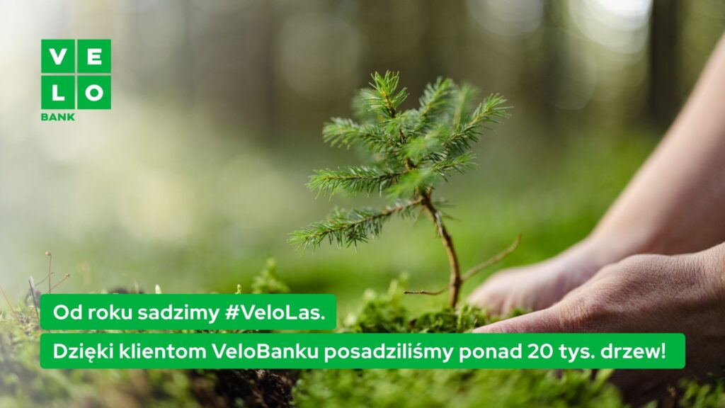 Świadomi konieczności dbania o stan naszej planety klienci VeloBanku chętnie włączają się do mającej już rok akcji „Sadzimy razem #VeloLas”. Inicjatywę uruchomiono w 2023 roku, w Dzień Ochrony Środowiska. Polega na sadzeniu drzew w zamian za założenie rachunku bankowego w kanałach zdalnych z użyciem uwierzytelnienia za pomocą aplikacji mObywatel. W ten sposób, w ciągu 12 miesięcy, VeloBank sfinansował w imieniu swoich klientów posadzenie ponad 20 tys. sadzonek, które zajmują powierzchnię ponad 2 hektarów.