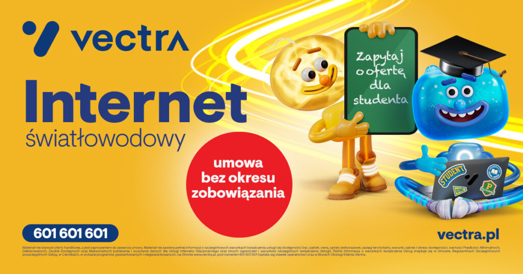 Vectra konsekwentnie rozwija swoją ofertę usług bez zobowiązań. W ramach przygotowań do nowego roku akademickiego operator wprowadził dedykowaną propozycję dla studentów i uczniów – Internet światłowodowy dostępny bez okresu zobowiązania.