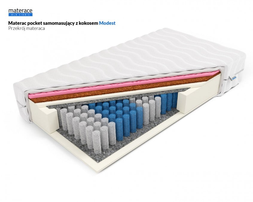 Przykładem doskonałego wyboru dla par ważących w przedziale 60–80 kg jest materac pocket samomasujący z kokosem Modest. Dzięki sprężynom kieszeniowym i warstwie kokosu zapewnia on równomierne podparcie, a dodatkowa funkcja mikromasażu zwiększa komfort snu i poprawia krążenie krwi.